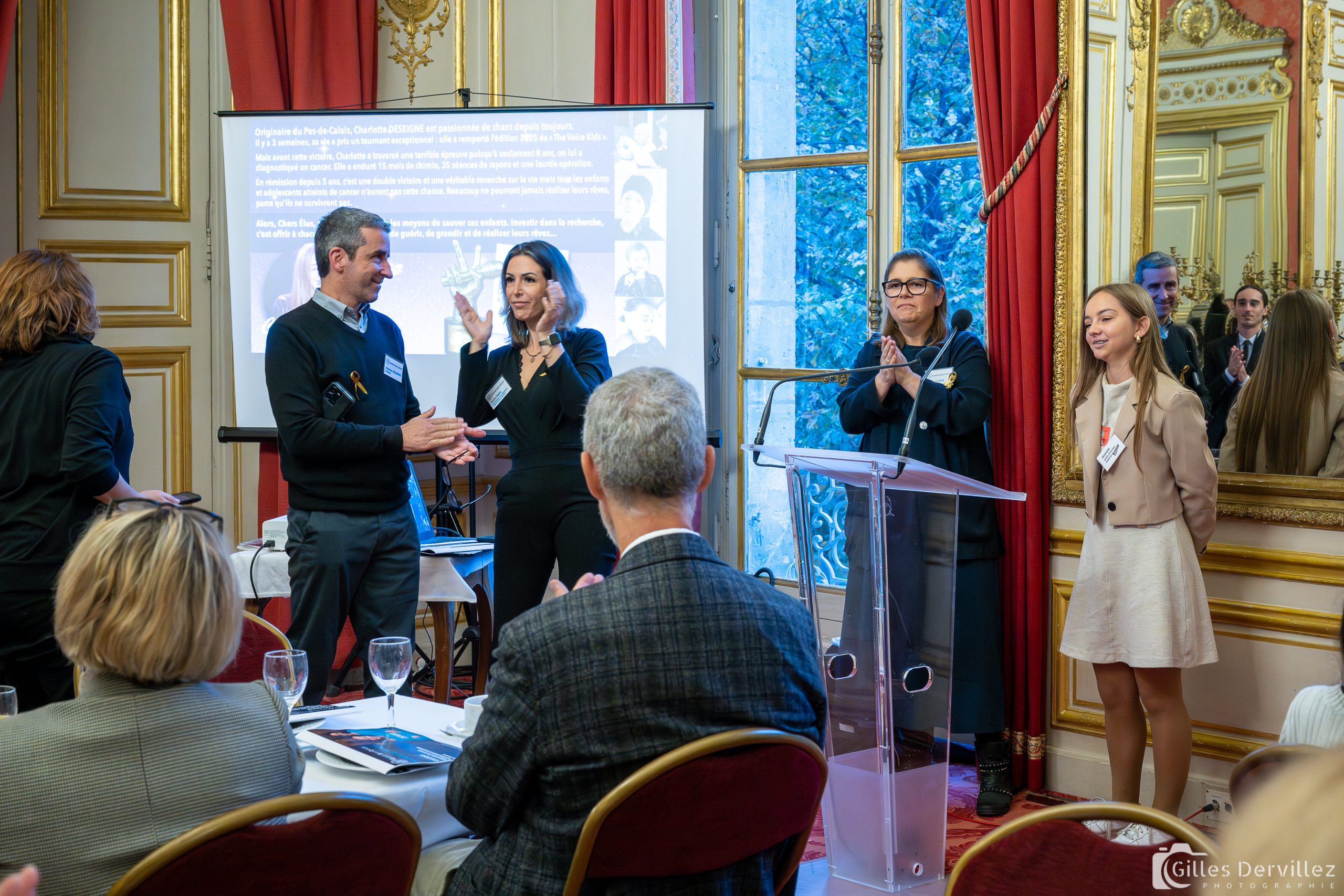 – Charlotte Deseigne, une adolescente courageuse de 15 ans, vainqueur de la finale de « The voice kids » sur TF1 après avoir combattu un cancer très agressif, pour son témoignage qui rappelle que notre pays doit mettre tous les moyens pour ces enfants et leurs familles.
